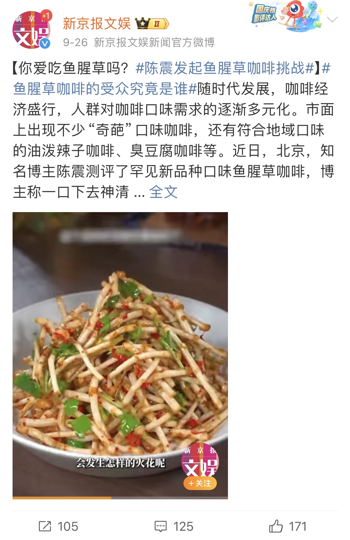 #揭秘鱼腥草咖啡的奇妙受众#、#CityDrink#、#鱼腥草咖啡味觉挑战#等热门话题如雨后春笋般涌现,轮番霸屏热搜榜。新京报文娱、陕西都市快报等媒体的官方微博纷纷以评论与转发之笔,勾勒出了这场跨界盛宴。
