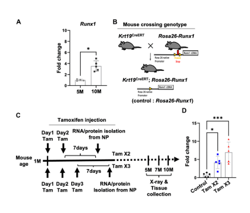 为揪出这个 衰老元凶 ,研究团队盯上了椎间盘退变的核心 髓核细胞,并量身打造了精准的小鼠模型:Krt19CreERT; Rosa26-Runx1。其中Krt19是髓核细胞的 身份标签 ,能让 Cre 重组酶只在髓核细胞中 上岗 ;而Rosa26是基因表达的 启动台 ,只要用他莫昔芬激活 Cre 酶,Runx1就会在髓核细胞中特异性 苏醒 。这种设计能排除其他细胞干扰,精准锁定Runx1的作用。实验结果令人震惊:正常小鼠要到 18 个月大(相当于人类老年)才出现椎间盘退变,而Runx1激活的小鼠在 5 个月大(人类青壮年)时,椎间盘就已 早衰 髓核塌陷,纤维环出现裂隙,和老年小鼠的病变几乎一致。