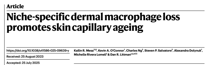 来自纽约大学医学院等机构的科学家们通过研究揭示了皮肤毛细血管相关巨噬细胞(CAMs)的丢失与皮肤毛细血管衰老之间的直接联系。随着年龄增长,皮肤不只是长皱纹、变松弛 伤口愈合变慢、容易感染、摸起来发凉,这些 隐形衰老 其实更影响生活质量。背后的关键原因之一,就是皮肤里负责 供血供氧 的毛细血管在悄悄衰退。