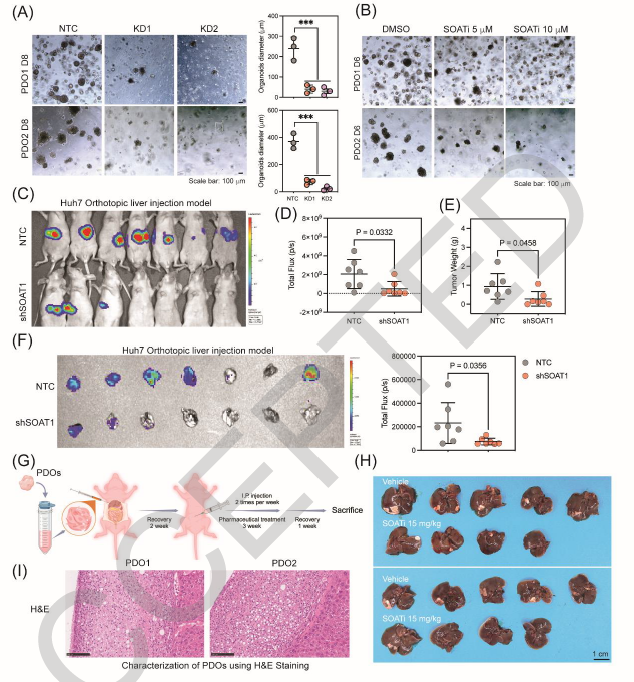 为验证SOAT1的功能,团队做了一系列实验:用基因手段敲低SOAT1,或用SOAT1抑制剂阿伐西米布处理,肝癌细胞增殖速度明显减慢,患者来源类器官的生长也被显著抑制。在小鼠模型中效果更直观:SOAT1敲低后,原位移植瘤的体积缩小、肺转移减少;若将野生型SOAT1重新导入细胞,肿瘤增殖能力能恢复,但导入催化失活的SOAT1突变体则无效,这说明SOAT1的促癌作用依赖其正常催化活性,特异性极强。
