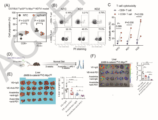 图5. 敲低胆固醇酰基转移酶1(SOAT1)可增强CD8+T细胞毒性并与抗PD-1免疫治疗协同作用于肝细胞癌