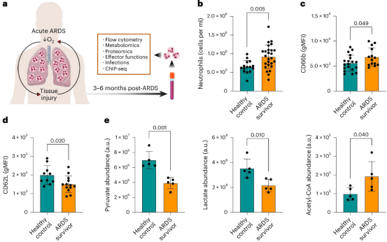 他们研究了 26 名 ARDS 康复者(3-6 个月后),发现这些人的中性粒细胞表面 CD66b(激活标志物)升高、CD62L(黏附标志物)降低,处于异常激活状态却 力不从心 体外实验中,它们吞噬金黄色葡萄球菌(S. aureus)的效率比健康人低 30%,释放 -1 抗胰蛋白酶(杀菌关键蛋白)的量减少 26%,甚至对 LPS 刺激的存活能力异常增强,反而容易引发慢性炎症。更危险的是,这些康复者中近 40% 在出院后 6 个月内出现二次感染,细菌、真菌感染都有,而健康人群同期感染率不足 5%。